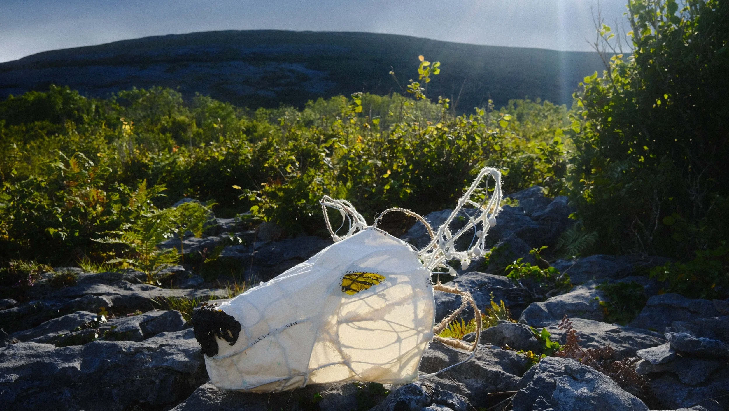 The mask is made of foraged and recycled material from around the Burren. The structure is tied with previously littered fishing line. Braided seaweed makes up its snout, and beads made from peat clay adorn the ears in place of cattle tags.