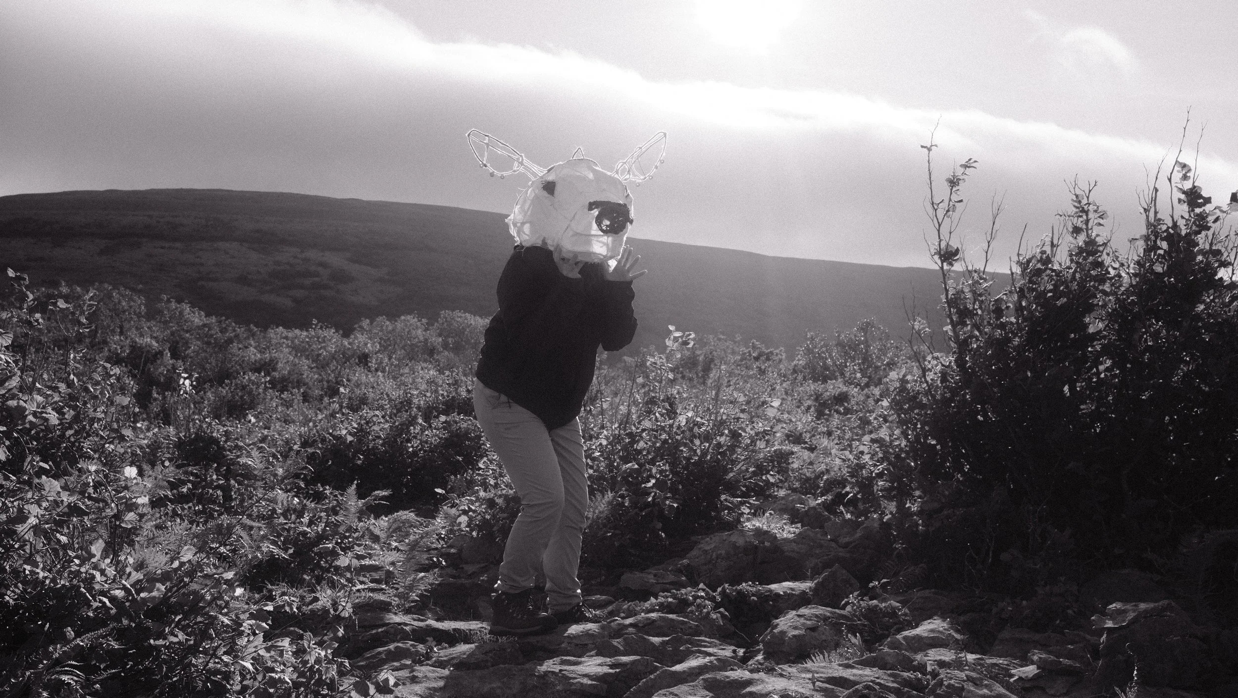 The back half of the piece is left open, the fitted window allowing it to be worn backwards. This mirror image reflects the symbiosis between the human and the grazer. Inhabiting the spirit of the cow promotes the maintenance of the Burren’s environment, but our human responsibility is not left far behind. The visibility of the wearer beneath the mask also promotes accountability. It is not a mask one wears to hide themself but one to reflect on and preserve the living landscape we inhabit.